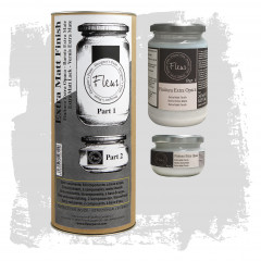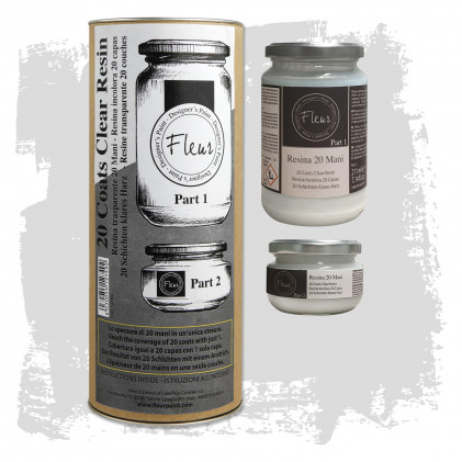 Miscela i componenti singolarmente e poi uniscili, mescolando per altri 2 minuti. Lascia riposare per circa 5 minuti. Applica a pennello entro 35 minuti dalla miscelazione. Per ottenere una resina colorata, miscela con un colore Fleur Chalky Look (10% di colore).